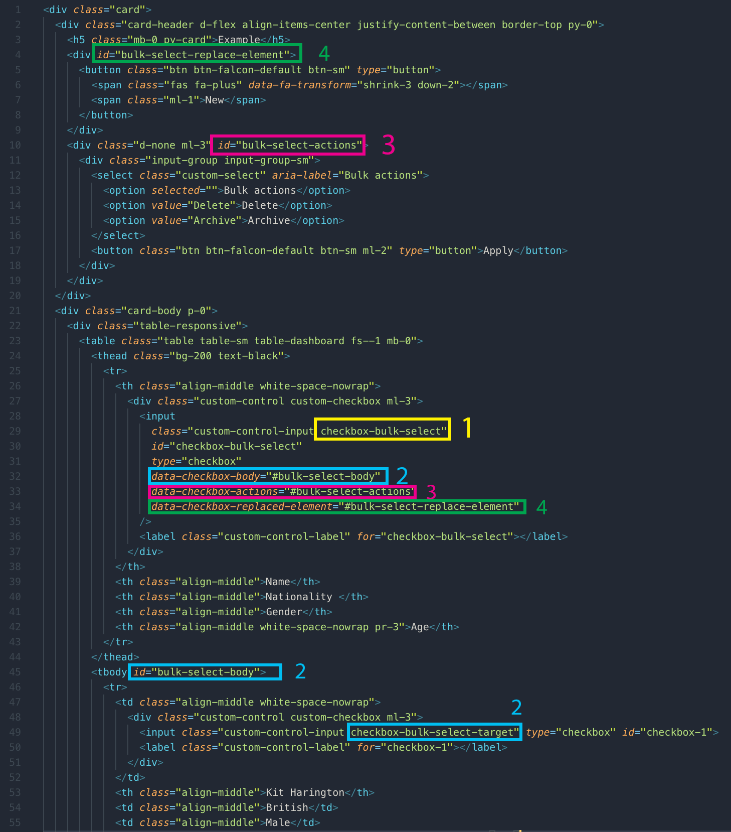 bulk-select-body. Every targeted checkbox within this wrapper is marked ascheckbox-bulk-select-target. The idbulk-select-bodyis used to hook it to the main checkbox withdata-checkbox-body="#bulk-select-body" - The element with id